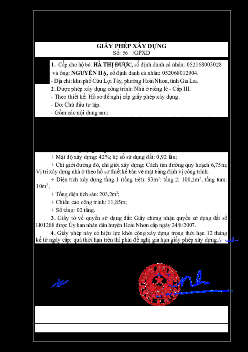 GIẤY PHÉP XÂY DỰNG Cấp cho hộ bà: HÀ THỊ ĐƯỢC và ông: NGUYỄN HẠ, Địa chỉ: khu phố Cửu Lợi Tây, phường Hoài Nhơn, tỉnh Gia Lai 02/10/2025, 14:21:01 - Lượt xem: 0 Tweet Thêm vào danh sách Báo xấu Thông tin tài liệu GIẤY PHÉP XÂY DỰNG Cấp cho hộ bà: HÀ THỊ ĐƯỢC và ông: NGUYỄN HẠ, Địa chỉ: khu phố Cửu Lợi Tây, phường Hoài Nhơn, tỉnh Gia Lai