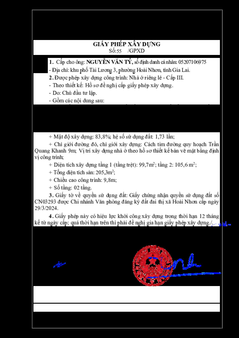 GIẤY PHÉP XÂY DỰNG Cấp cho ông: NGUYỄN VĂN TÝ, Địa chỉ: khu phố Tài Lương 3, phường Hoài Nhơn, tỉnh Gia Lai 01/10/2025, 14:20:26 - Lượt xem: 0 Tweet Thêm vào danh sách Báo xấu Thông tin tài liệu GIẤY PHÉP XÂY DỰNG Cấp cho ông: NGUYỄN VĂN TÝ, Địa chỉ: khu phố Tài Lương 3, phường Hoài Nhơn, tỉnh Gia Lai