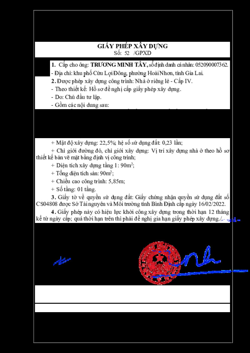 GIẤY PHÉP XÂY DỰNG Cấp cho ông: TRƯƠNG MINH TÂY, Địa chỉ: khu phố Cửu Lợi Đông, phường Hoài Nhơn, tỉnh Gia Lai 29/09/2025, 14:16:48 - Lượt xem: 0 Tweet Thêm vào danh sách Báo xấu Thông tin tài liệu GIẤY PHÉP XÂY DỰNG Cấp cho ông: TRƯƠNG MINH TÂY, Địa chỉ: khu phố Cửu Lợi Đông, phường Hoài Nhơn, tỉnh Gia Lai