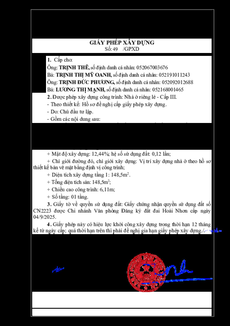 GIẤY PHÉP XÂY DỰNG Ông: TRỊNH THÊ, Bà: TRỊNH THỊ MỸ OANH, Ông: TRỊNH ĐỨC PHƯƠNG, Bà: LƯƠNG THỊ MẠNH 25/09/2025, 11:25:29 - Lượt xem: 0 Tweet Thêm vào danh sách Báo xấu Thông tin tài liệu GIẤY PHÉP XÂY DỰNG Ông: TRỊNH THÊ, Bà: TRỊNH THỊ MỸ OANH, Ông: TRỊNH ĐỨC PHƯƠNG, Bà: LƯƠNG THỊ MẠNH