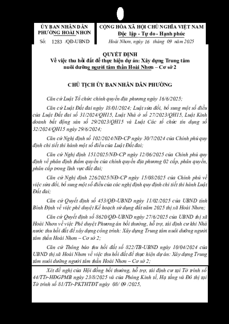 Quyết định thu hồi đất để thực hiện dự án Xây dựng Trung tâm nuôi dưỡng người tâm thần Hoài Nhơn - Cơ sở 2 của bà Nguyễn Thị Báu Ng 29/09/2025, 13:41:07 - Lượt xem: 0 Tweet Thêm vào danh sách Báo xấu Thông tin tài liệu Quyết định thu hồi đất để thực hiện dự án Xây dựng Trung tâm nuôi dưỡng người tâm thần Hoài Nhơn - Cơ sở 2 của bà Nguyễn Thị Báu Ng
