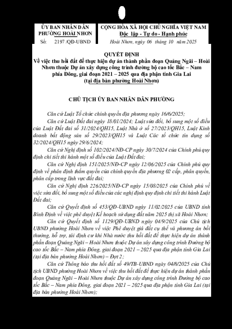QUYẾT ĐỊNH Về việc thu hồi đất để thực hiện Dự án xây dựng công trình đường bộ cao tốc Bắc – Nam phía Đông, giai đoạn 2021 – 2025 qua địa phận tỉnh Gia Lai (tại địa bàn phường Hoài Nhơn) của UBND phường