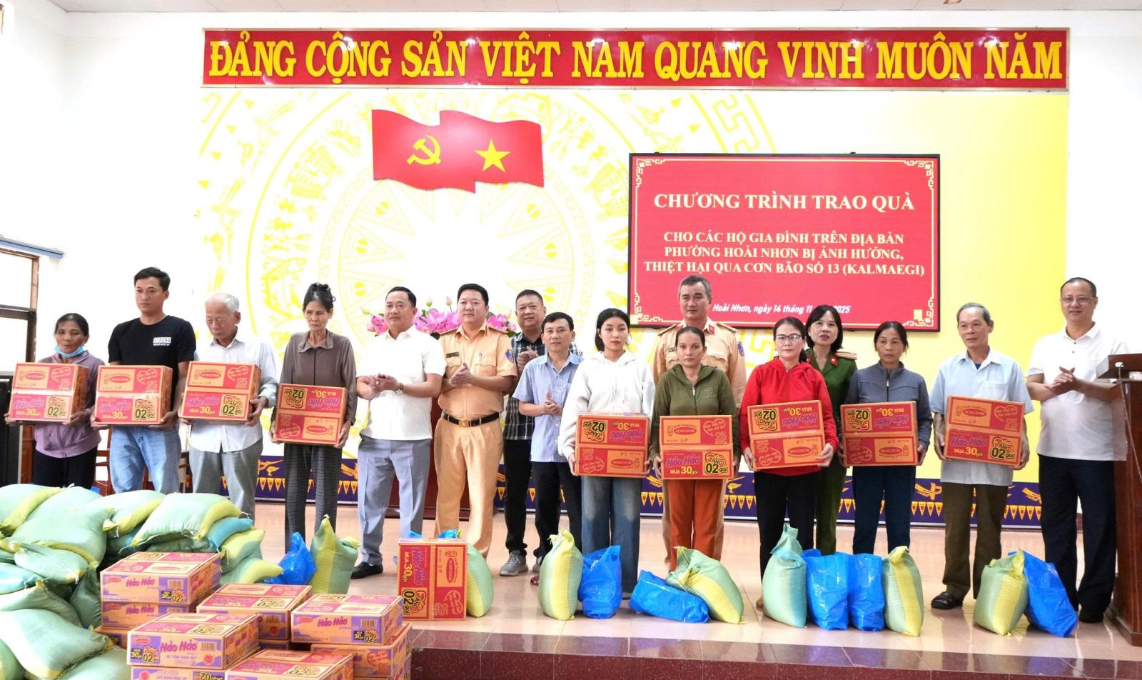Sáng ngày 14/11/2025, Công an phường Hoài Nhơn phối hợp với Phòng Cảnh sát giao thông Công an tỉnh Gia Lai (PC08) tổ chức chương trình trao quà cho các hộ gia đình trên địa bàn phường bị ảnh hưởng, thiệt hại do bão số 13 (Kalmaegi) gây ra.